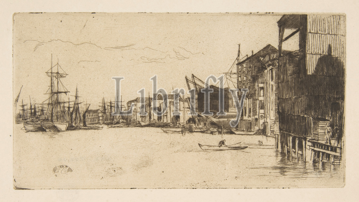 Free Trade Wharf, 1877, Etching, drypoint, fourth state, eight, Glasgow, published, Fine Art Society, printed, black ink, ivory laid paper, Plate, 3 13/16, 7 1/4, 9.7, 18.4 cm, Prints, James McNeill Whistler, American, Lowell, Massachusetts, 1834–1903, London