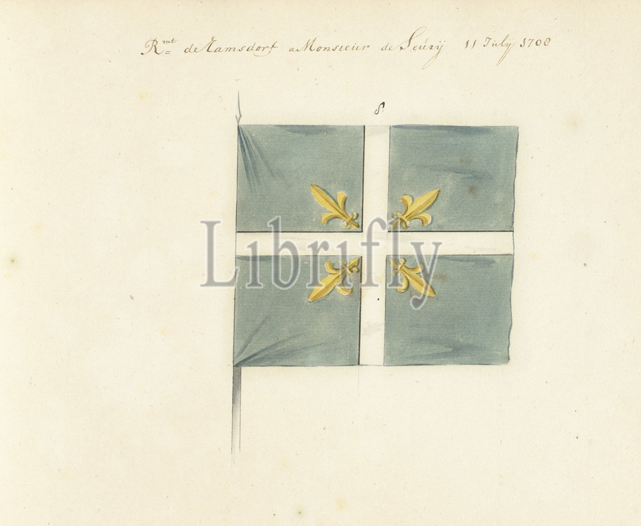 French banner captured at the battle of Oudenaarde, 1708, Rmt. de Ramsdorf a Monsieur de Seury 11 July 1708 (title on object), French banner captured at the battle of Oudenaarde in 1708. In the book of drawings of French banners, standards and timpani captured during the War of the Spanish Succession (1701-1713)., draughtsman: anonymous, Northern Netherlands, 1713 - 1720, paper, writing (processes), drawing, height 172 mm × width 230 mm