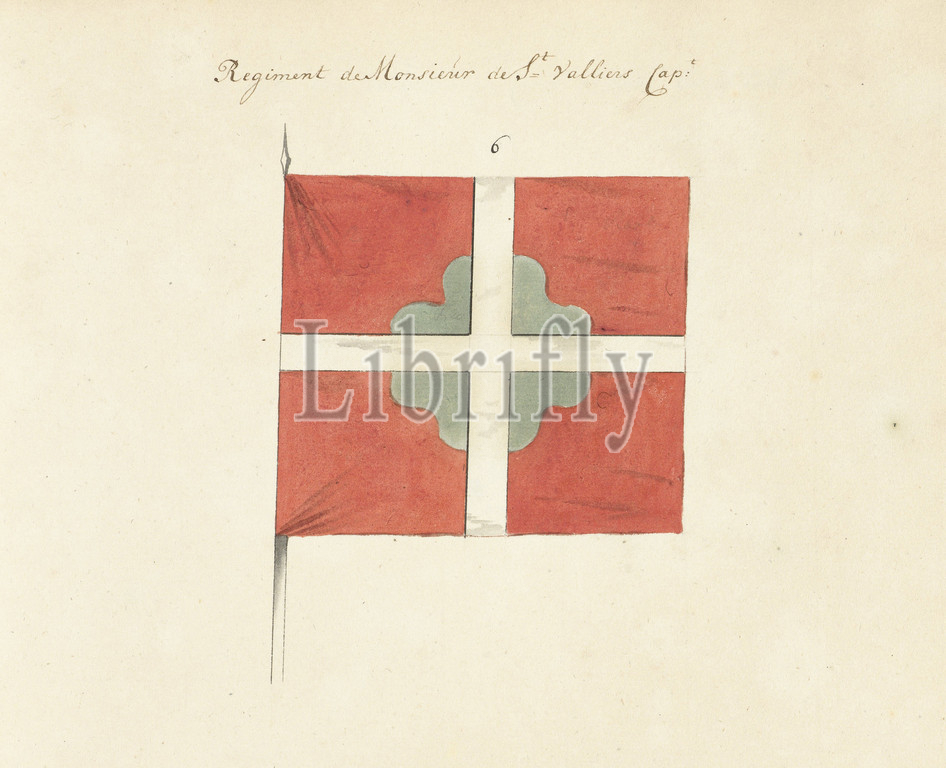 French banner captured at the battle of Ramillies, 1706, Regiment de Monsieur de St. Valliers Capt. (title on object), French banner captured at the battle of Ramillies 1706. In the book of drawings of French banners, standards and timpani captured during the War of the Spanish Succession (1701-1713)., draughtsman: anonymous, Northern Netherlands, 1713 - 1720, paper, writing (processes), drawing, height 172 mm × width 230 mm