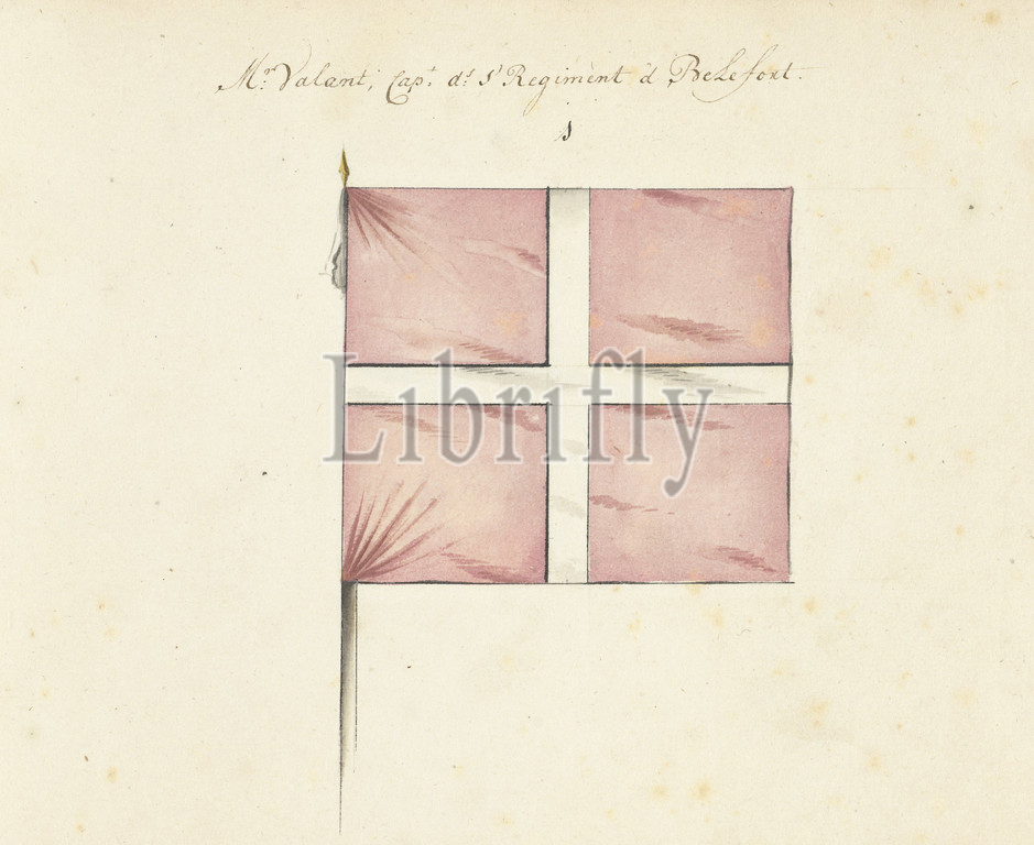 French banner captured at the battle of Spierbach, 1703, Mr. Valant; Capt. ds.s. Regiment d. Belefort (title on object), French banner captured at the battle of Spierbach, 1703. In the book of drawings of French banners, standards and timpani captured during the War of the Spanish Succession (1701-1713)., draughtsman: anonymous, Northern Netherlands, 1713 - 1720, paper, writing (processes), drawing, height 172 mm × width 230 mm