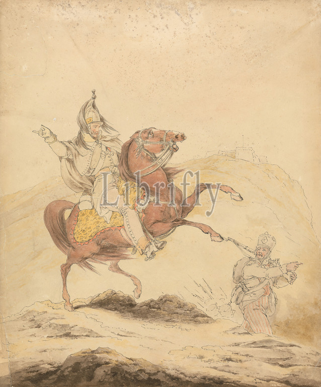 French Dragoon, Sir Robert Kerr Porter, 1777–1842, British, ca, 1810, Watercolor, pen, black ink, graphite, medium, slightly textured, cream wove paper, Sheet, horses, animals, military art, soldiers