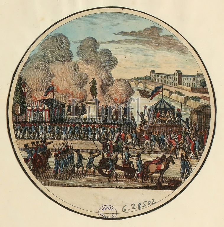 French Revolution :Day of July 22, 1792: Parade of municipal officers proclaiming the fatherland in danger, in front of the statue of Henri IV on the Pont Neuf. 1st district. Nº82 of the 6th plate of the 'Galerie historique..' circa 1799, Lorent or Laurent, Jean-François, Draughtsman, Jacowick, G., Engraver, Chateigner, Editor, Circa 17941804, Graphic arts, French Revolution, Print, Diameter: 9.1 cm