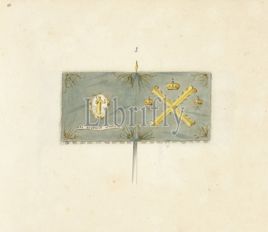 French standard captured at the battle of Spierbach, 1703, French standard captured at the battle of Spierbach, 1703. In the book of drawings of French banners, standards and timpani captured during the War of the Spanish Succession (1701-1713)., draughtsman: anonymous, Northern Netherlands, 1713 - 1720, paper, drawing, height 172 mm × width 230 mm