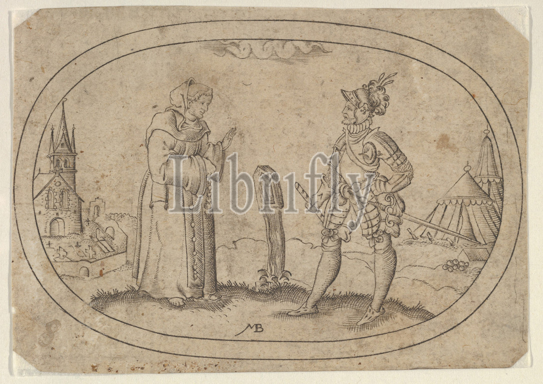 A Friar and a Soldier, from Das Bossenbüchlein, ca. 1582, Engraving, Sheet: 2 3/8 × 3 3/8 in. (6.1 × 8.6 cm), Mathais Beitler (German, Ansbach, active ca. 1582–1616), A friar at left greets a military captain at right. A cathedral with a graveyard at far left, and military tents at right. From a set of 12 plates of vessel designs.