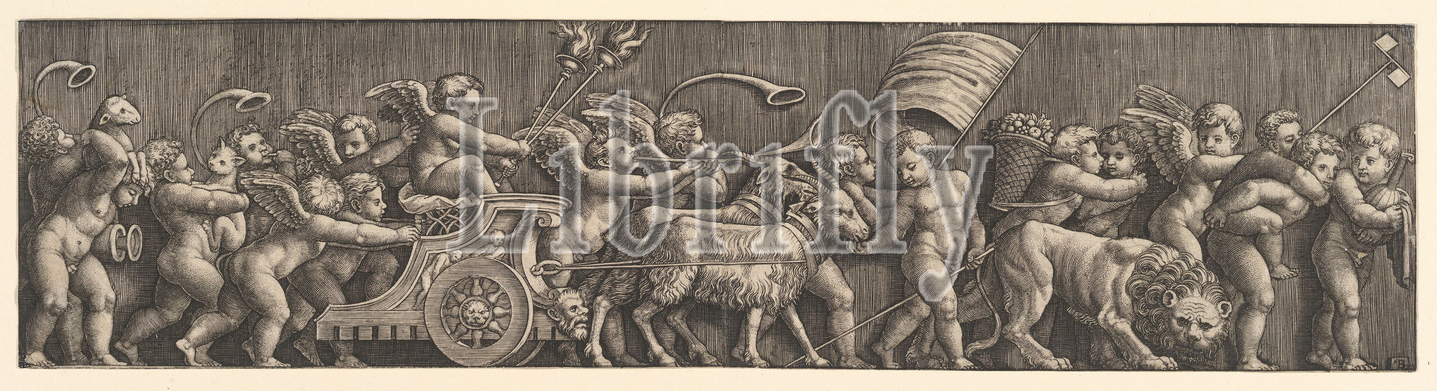 A frieze arrangement depcting the Triumph of Love; Cupid in a Chariot led by goats, many other putt filling the composition, 1530–60, Engraving, sheet: 3 15/16 x 15 15/16 in. (10 x 40.5 cm), Prints, Master of the Die (Italian, active Rome, ca. 1530–60), After Raphael (Raffaello Sanzio or Santi) (Italian, Urbino 1483–1520 Rome), Forms a pair.