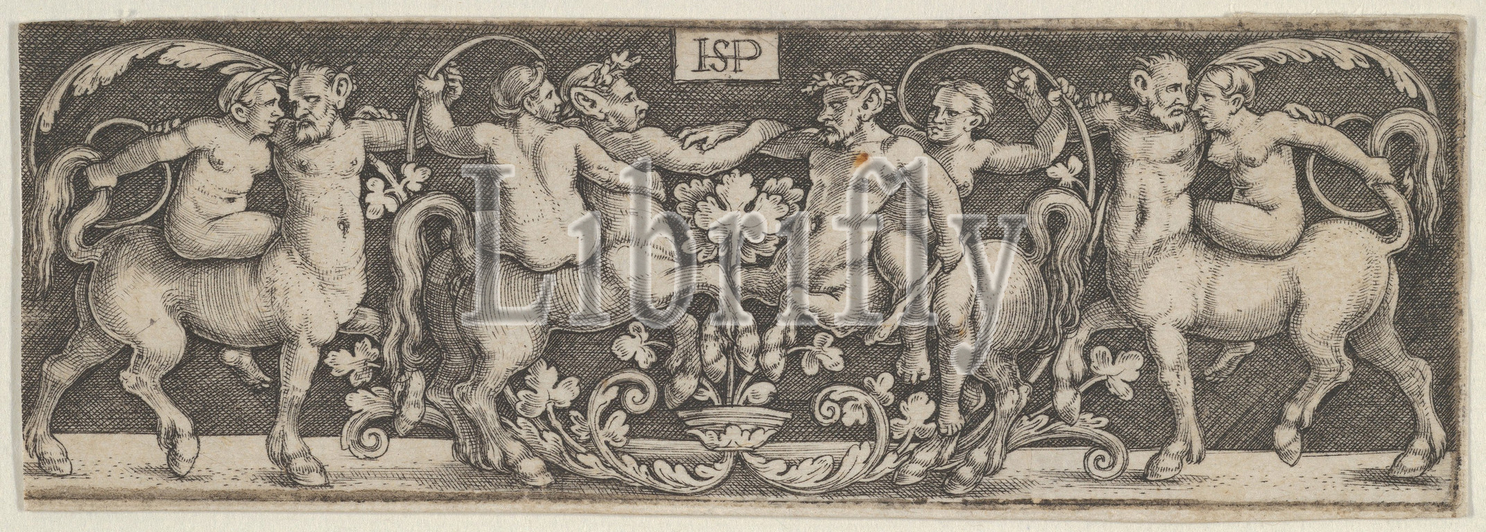Frieze, Centaurs Fighting, Center, Human Riders, 1500–1550, Engraving, second state, two, Pauli, Sheet, 1 1/16 x 3 1/4, 2.7 8.2 cm, Sebald Beham, German, Nuremberg, Frankfurt, centaurs fighting, center, pair, ridden, female figures face, flanked, another mounted, centaurs, heads turned, outwards, riders