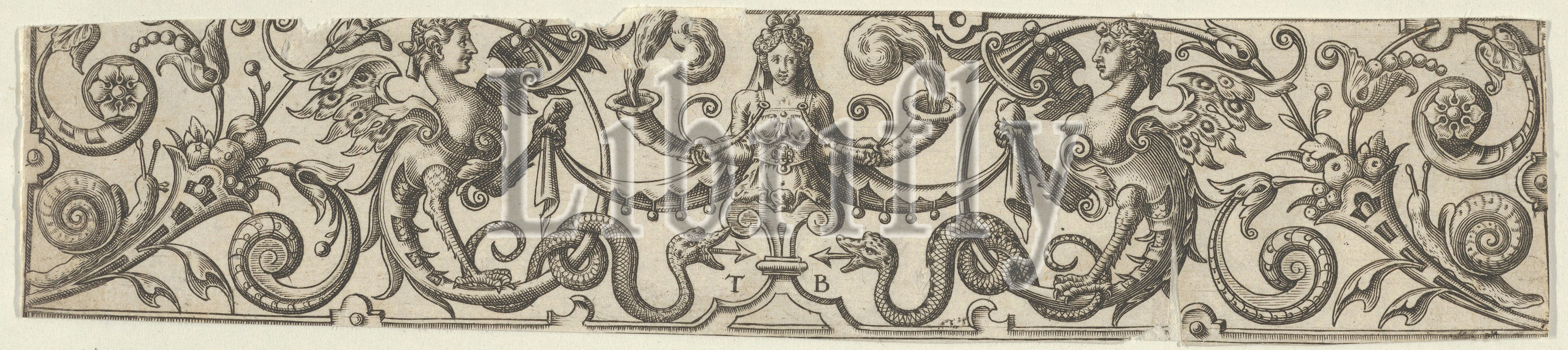 Frieze with Half-Length Female Figure Holding Two Horns at Center, ca. 1590, Engraving, Sheet: 1 9/16 × 6 13/16 in. (3.9 × 17.3 cm), Theodor de Bry (Netherlandish, Liège 1528–1598 Frankfurt), Frieze with a half-length female figure on top of a strapwork ornament holding two horns emitting smoke at center. At either side, grotesques with human heads and tails ending in serpents hold the ends of fabric that drapes from central figure's hair