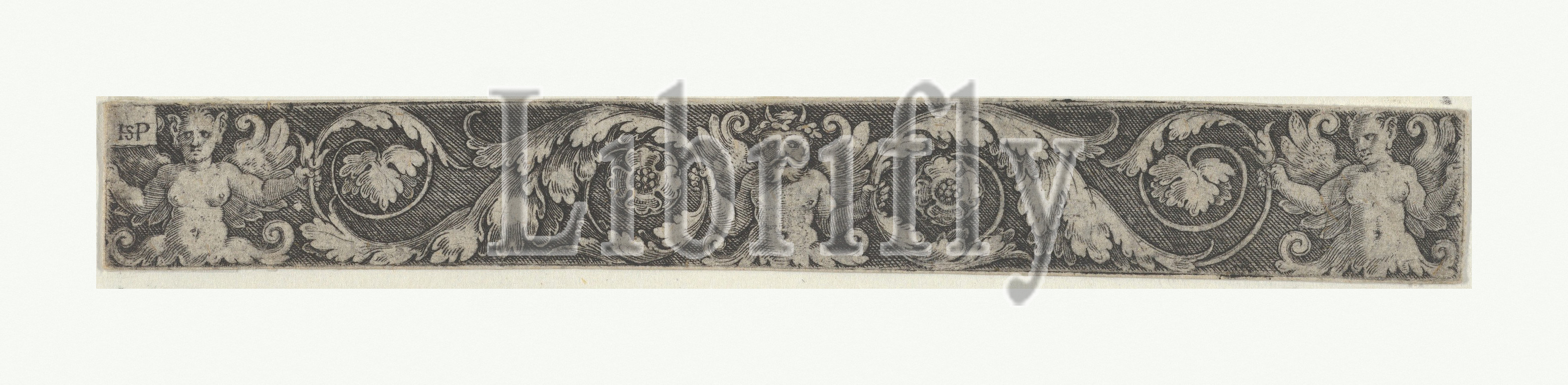 Frieze, Horned Male Figure, Center, Two Tendrils Held, Winged Female Figures, 1500–1550, Engraving, Sheet, 5/8 x 5 1/4, 1.6 13.3 cm, Prints, Sebald Beham, German, Nuremberg, Frankfurt, Ornament panel, horned male, figure, center flanked, scrolling tendrils, two female, figures, far left, right