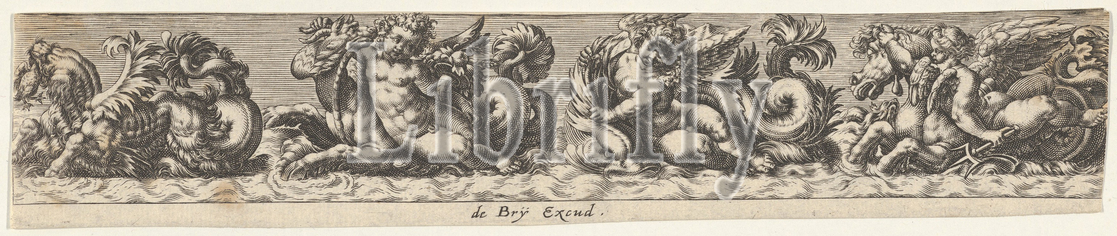 Frieze, Sea Monsters, 1580–1600, Engraving, Sheet, 1 9/16, 7 15/16, 3.9, 20.2 cm, Johann Theodor de Bry, Netherlandish, Strasbourg, 1561–1623, Bad Schwalbach, after Giovanni Andrea Maglioli, Italian, active, 1580–1610, four sea monsters, three creatures, right, ridden, putti, creature, far left, devours, bird, series, five plates, Giovanni Andrea, Maglioli, SKB 4350