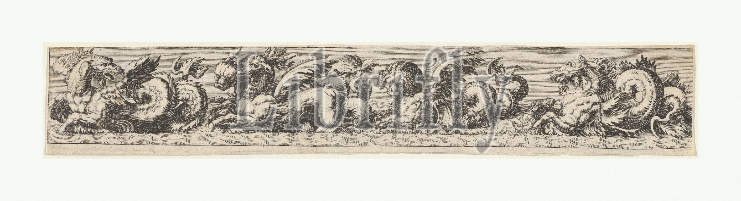 Frieze, Sea Monsters, 1580–1600, Engraving, Sheet, 1 1/2, 8 9/16, 3.8, 21.7 cm, Johann Theodor de Bry, Netherlandish, Strasbourg, 1561–1623, Bad Schwalbach, after Giovanni Andrea Maglioli, Italian, active, 1580–1610, five sea monsters, wings, horse, front legs, serpentine tails, heads, various beasts, animals, far right, series, plates, Giovanni Andrea, Maglioli, SKB 4350