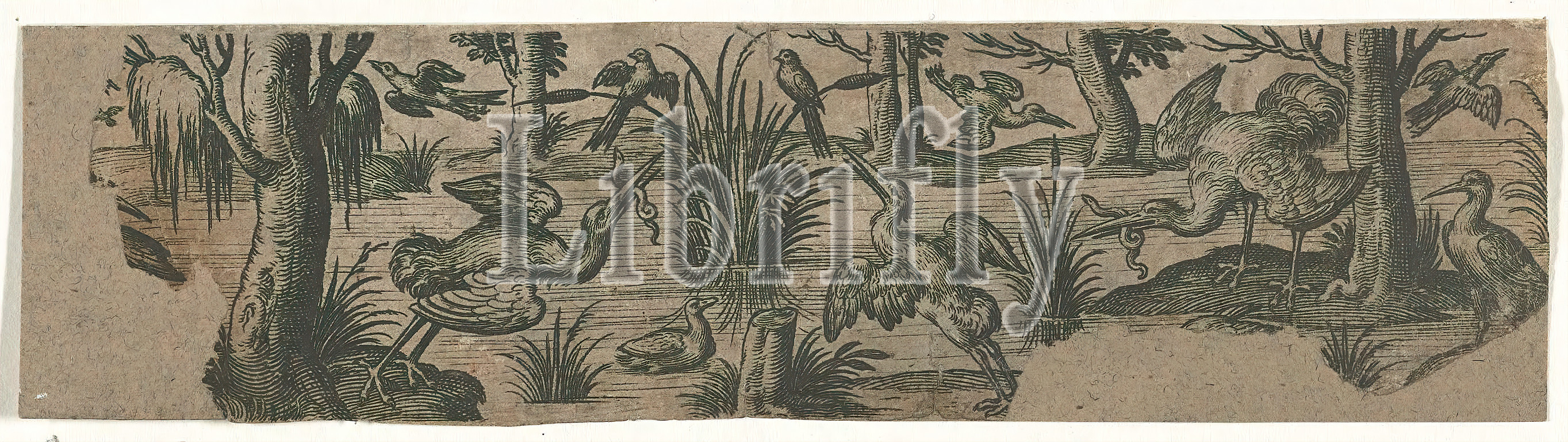 Frieze, ten birds, water Frisians, birds, series title, large birds, front, worm, beak, middle two birds, reed stems, waterfront, trees, Birds, landscapes, waters, waterscapes, seascapes, temperate zone, plants, herbs, reed, Nicolaes de Bruyn, mentioned, object, 1581, 1656, paper, engraving