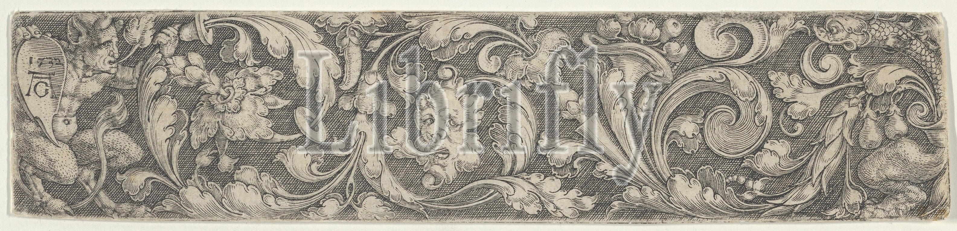 Frieze with Tendrils Growing from a Plant at Right and a Satyr Holding a Shield with the Artist's Monogram, 1532, Engraving, Sheet: 1 7/16 × 6 9/16 in. (3.7 × 16.7 cm), Heinrich Aldegrever (German, Paderborn ca. 1502–1555/1561 Soest), Ornamental design showing a crouching satyr at far left bearing a shield with the artist's monogram and the date. The foliate scrollwork to the satyr's right is inhabited with a mask (at center) and a fish (at right)