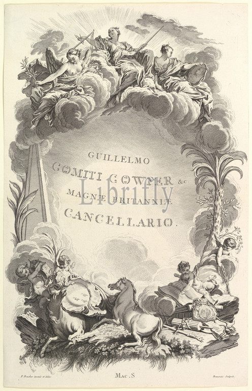 Frontispice pour le 'Tombeau du comte William Cowper' (Frontispiece from the 'Tomb of William Cowper'), from Tombeaux des Princes, des Grands Capitaines et autres Hommes illustres (Tombs of Princes, Great Captains, and other Illustrious Men), ca. 1736, Etching and engraving, Sheet: 25 11/16 x 16 7/16 in. (65.2 x 41.8 cm), Nicolas Dauphin de Beauvais (French, Paris 1687–1763 Paris), After François Boucher (French, Paris 1703–1770 Paris)