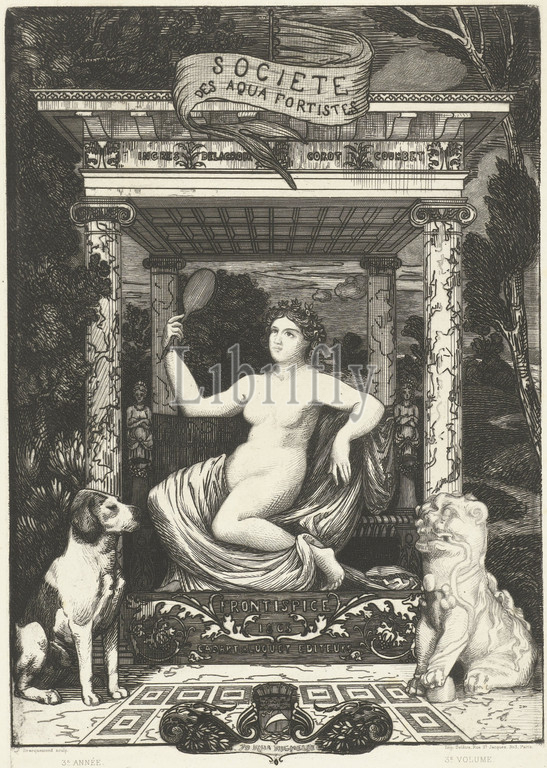 Frontispice for the third volume of the album of the Société des Aquafortistes with allegory on beauty and nature and art. A naked woman with a mirror sits on a monumental throne in the shape of a small temple. To the left in front of the throne sits a dog of flesh and blood and to the right is an oriental statue of a dog. On a banner on the roof of the throne is the name of the organisation, Frontispice for an album by the Société des Aquafortistes with allegory on beauty and nature and art Frontispice for an album by the Société des Aquafortistes., print maker: Félix Bracquemond, (mentioned on object), Félix Bracquemond, printer: Auguste Delâtre, (mentioned on object), 1865, paper, etching, h 356 mm × w 247 mm, h 466 mm × w 334 mm