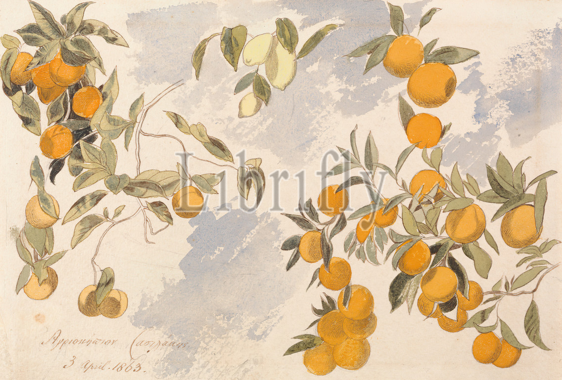 Fruit trees, 3 April 1863, Edward Lear, 1812–1888, British, 1863, Watercolor with pen in brown ink over graphite on moderately thick, rough, cream wove paper, Sheet: 16 13/16 x 10 inches (42.7 x 25.4 cm), botanical subject, branches, food, fruit, leaves, lemons, science, still life, study (visual work)