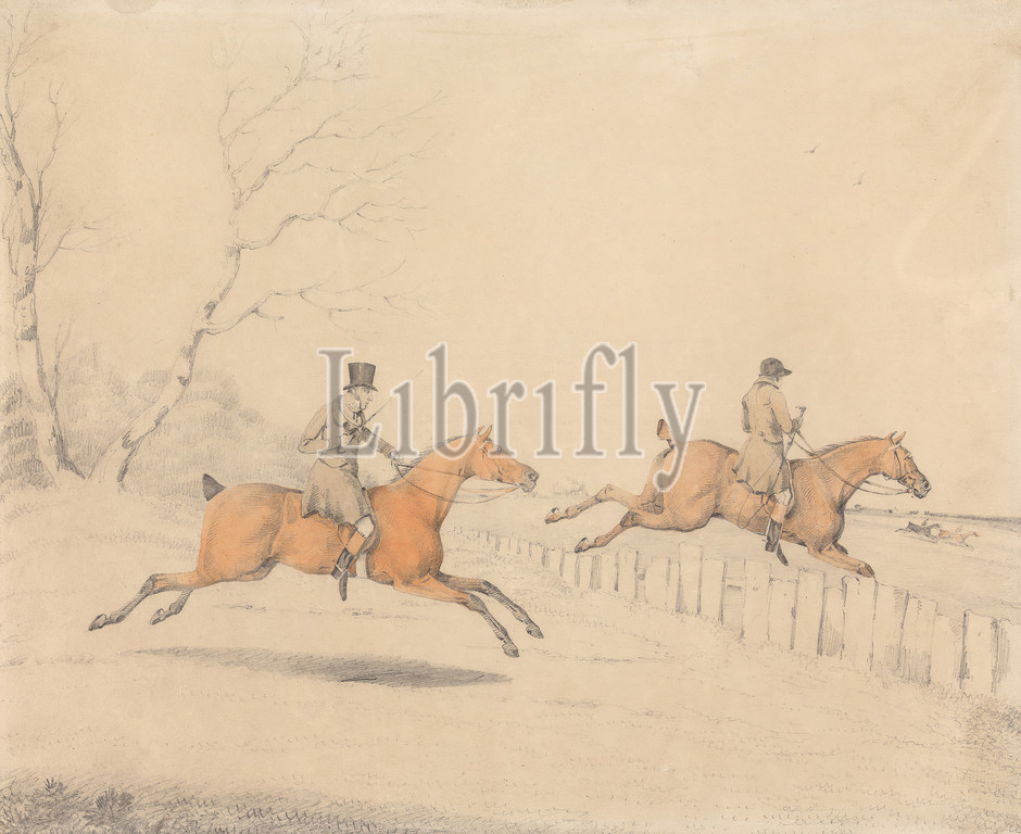 Full Cry, Henry Thomas Alken, 1785–1851, British, Samuel Henry Gordon Alken, 1810–1894, British, Graphite, watercolor, medium, slightly textured, blued white, wove paper, Sheet, fence, galloping, horseback riders, horseback riding, horses, animals, jumping, landscape, men, sporting art, trees