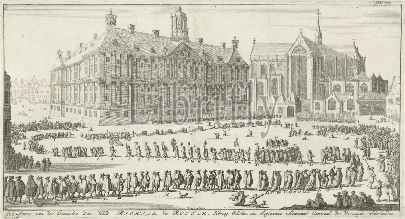 Funeral procession of Michiel de Ruyter, 1677 Lyk-station of the famous Sea Hero Michiel de Ruyter, Duke, Knight etc. Luijtenant Admiral General of the United Netherlands (title on object) The funeral procession of Michiel de Ruyter in Amsterdam on March 18, 1677. The procession goes over the Dam along the town hall to the Nieuwe Kerk. Below the show the title. Numbered top right: fol 781, funerary ceremonial, cortege, funeral procession, church (exterior), townhall, Nieuwe Kerk, City Hall of Amsterdam (1655-1808), Dam, Michiel Adriaansz. de Ruyter, Jan Luyken (mentioned on object), Amsterdam, 1683, paper, engraving, h 173 mm × w 319 mm
