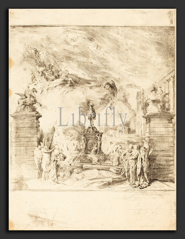 Gabriel, Jacques, Saint-Aubin, French, 1724, 1780, Allegorie, l'Erection, Statue, Louis, XV, Allegory, Establishment, 1763, etching, traces, roulette, engraving, Gabriel Jacques de Saint-Aubin