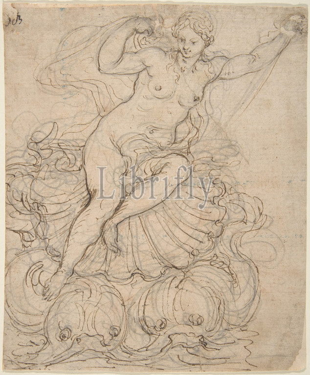 Galatea, Chariot drawn, Dolphins, 1652–1725, Pen, brown ink, preliminary drawing, black chalk, sheet, 7 3/16 x 5 7/8, 18.2 15 cm, Attributed to Giovanni Battista Foggini, Italian, Florence