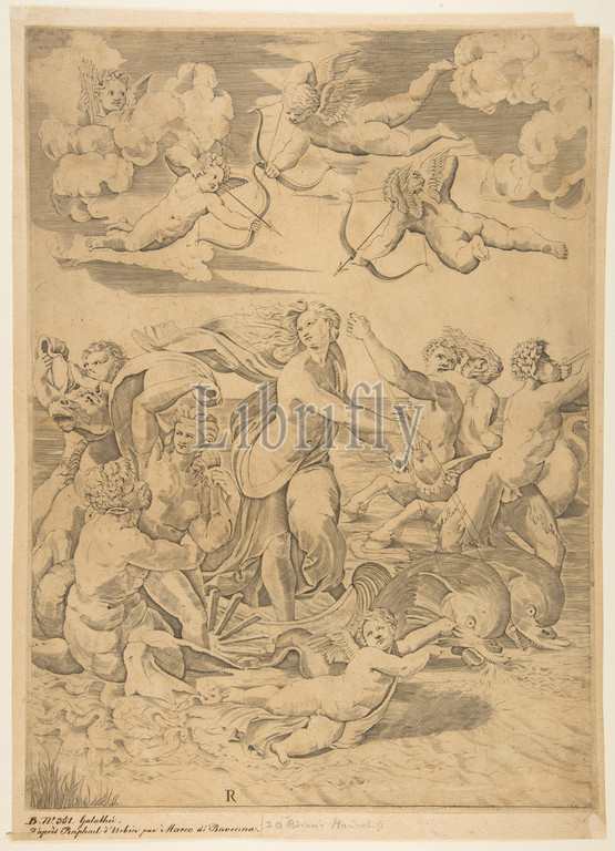 Galatea riding, shell pulled, water, dolphins, cupid, four, left, triton embracing, nymph, man, horseback blowing, conch, right, figure, horn, nymph, centaur, ca, 1515–27, Engraving, Sheet, Trimmed, 15 3/4, 11 9/16, 40, 29.3 cm, Prints, Marco Dente, Italian, Ravenna, active by, 1515–died, 1527, Rome, After Raphael, Raffaello Sanzio or Santi, Urbino, 1483–1520