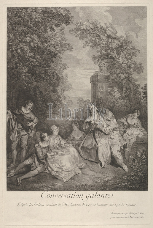 Gallant conversation' (Conversation galante): couples engage in conversation in a garden setting, at left a musician plays for the group, at right a woman holds a reclining lap dog, 1743, Etching and engraving, Sheet: 18 11/16 x 13 7/8 in. (47.5 x 35.2 cm), Prints, Jacques Philippe Le Bas (French, Paris 1707–1783 Paris), After Nicolas Lancret (French, Paris 1690–1743 Paris)