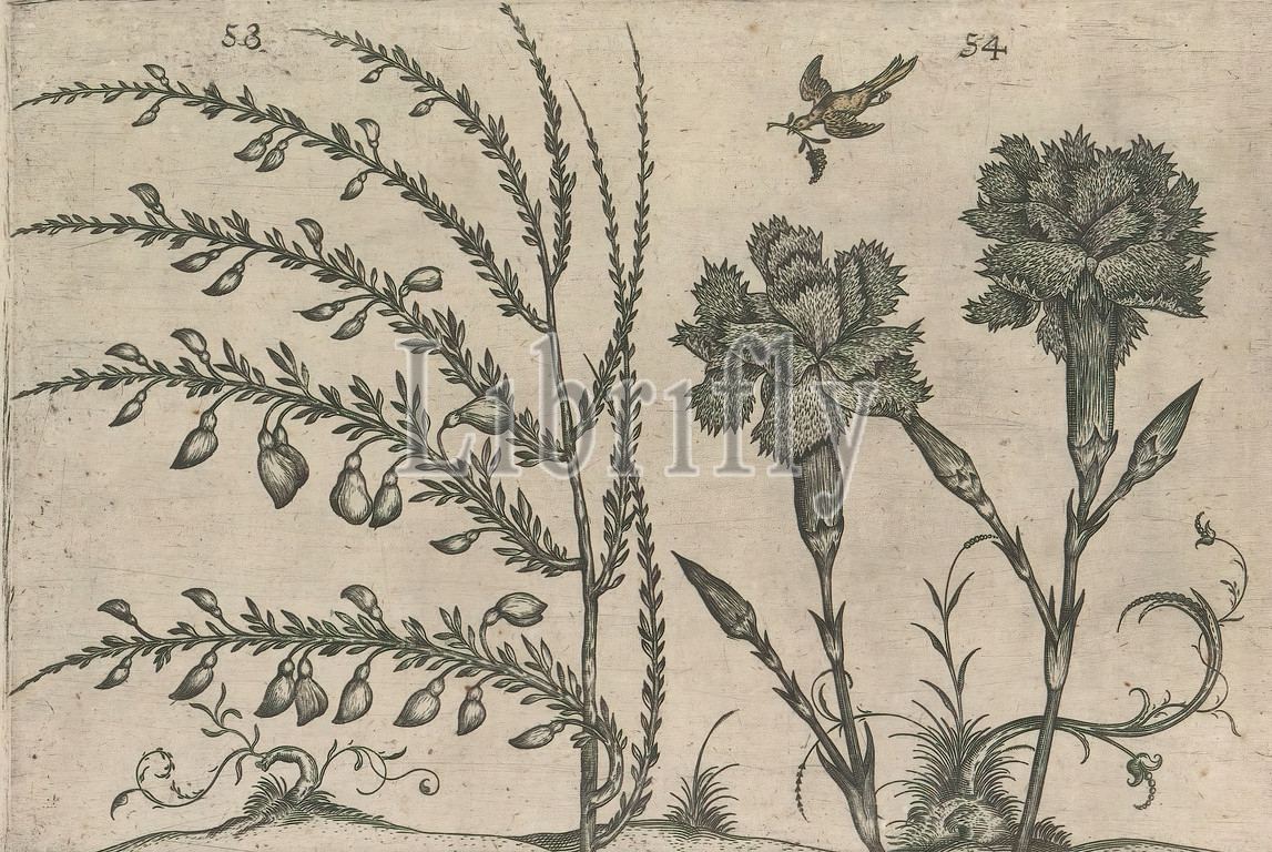 Garden carnation, Dianthus caryophyllus, broom, Cytisus scoparius, bird, ornamental plants, FIGs, 53, 54 hand-numbered 27, Anselmi Boetii de Boot I.C, Brugensis & Rodolphi II, Imp, Novel, medici, cubiculis Florum, Herbarum, ac fructuum selectiorum icones, & vires pleraeque hactenus ignotæ, Part, album, sheets, plates, De Boodts herbarium, 1640, twelfth, twelve albums, watercolors, animals, birds, plants, 1600, commissioned, Emperor Rudolf II, flowers, NAME, carnation birds, 1604, 1632, paper, ink, watercolor, paint, engraving
