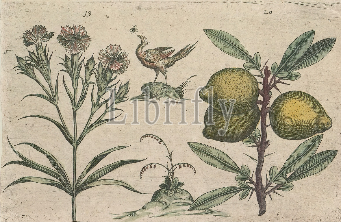 Garden carnations, Dianthus caryophyllus, lemons, Citrus limon, thorny, bird hopping, fly, small ornamental plant, FIGs, 19, 20, leaf numbered, hand 11, Anselmi Boetii de Boot I.C, Brugensis & Rodolphi II, Imp, Novel, medici, cubiculis Florum, Herbarum, ac fructuum selectiorum icones, & vires pleraeque hactenus ignotæ, Part, album, sheets, plates, De Boodt's herbarium, 1640, twelfth, twelve albums, watercolors, animals, birds, plants, 1600, commissioned, Emperor Rudolf II, flowers, carnation, fruits, lemon, 1604, 1632, paper, ink, watercolor, paint, engraving