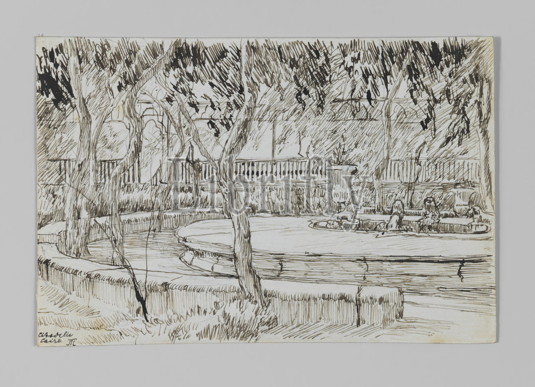 Garden of the Citadel, Caire, Jardin de la citadelle, Caire, The Life of Our Lord Jesus Christ, La Vie de Notre-Seigneur Jésus-Christ, James Tissot, French, 1836-1902, Pen and ink on paper mounted on board, Africa, 1886-1887 or 1889, Sheet: 3 9/16 x 5 5/16 in., 9 x 13.5 cm, 19th Centrury, Cairo, drawing, Egypt, fence, fountain, garden, IMLS, painting, park, path, sketch, study, tissot, tree, trees