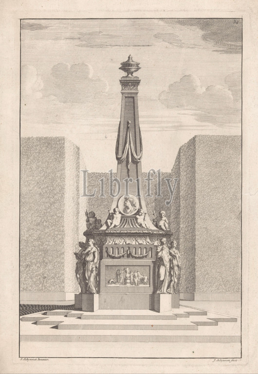 Garden ornament, obelisk Examples, pleasure gardens, zynde pyramids, honorary acids, byworks, series title, garden ornament, form, obelisk, portrait, acclaimed person, vase, Putti, torches surround, medallion, Women, obelisks, garden ornaments, standing, corners, pedestal, Jacobus Schijnvoet, mentioned, object, 1695, 1733, paper, engraving