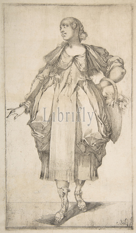 Gardener with a Basket on her Arm, from Hortulanae series, 1612–16, Etching and engraving, Sheet: 13 11/16 x 8 5/16 in. (34.8 x 21.1 cm), Prints, Jacques Bellange (French, Bassigny (?) ca. 1575–1616 Nancy)