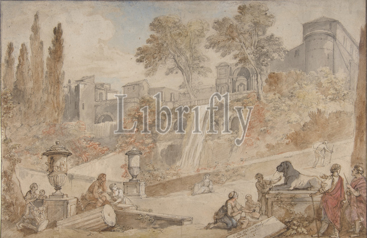 Gardens, Villa d'Este, Tivoli, 1760, Pen, brown ink, brush, brown, gray wash, watercolor, heightened, white, black, red chalk, 12 5/16 x 18 11/16, 31.3 47.5 cm, Drawings, Charles Joseph Natoire, French, Nîmes, 1700–1777, Castel Gandolfo, Director, French Academy, Rome, 1751, 1775, Natoire taught, young French artists, Hubert Robert, Jean Honoré, Fragonard, period, received occasional, commissions, paintings, increasingly devoted, time, landscape drawings, worked up