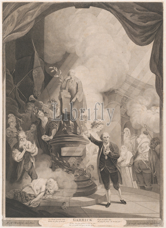 Garrick Speaking, Jubilee Ode, 1784, Stipple engraving, Sheet, trimmed, plate, 24 7/16, 17 1/2, 62, 44.5 cm, Prints, after Robert Edge Pine, British, London, 1720/30?–1788, Philadelphia, Pennsylvania, 1769, David Garrick, organized, Shakespeare Jubilee, three-day extravaganza, held, Stratford-upon-Avon, September 6th, 9th, months, advance publicity, opening dinner, followed, unveiling, new statue, Bard, town hall, Garrick, declamation, ode written, occasion
