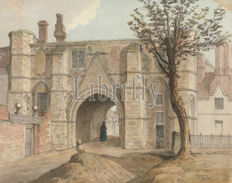 Gatehouse, Reading Abbey, Samuel Hieronymus Grimm, 1733–1794, Swiss, Watercolor, brown ink, graphite, medium, slightly textured, cream laid paper, Sheet, chimneys, architectural elements, dog, animal, fence, gatehouses, landscape, school, trees, women, Berkshire, England, Reading, Reading abbey, United Kingdom