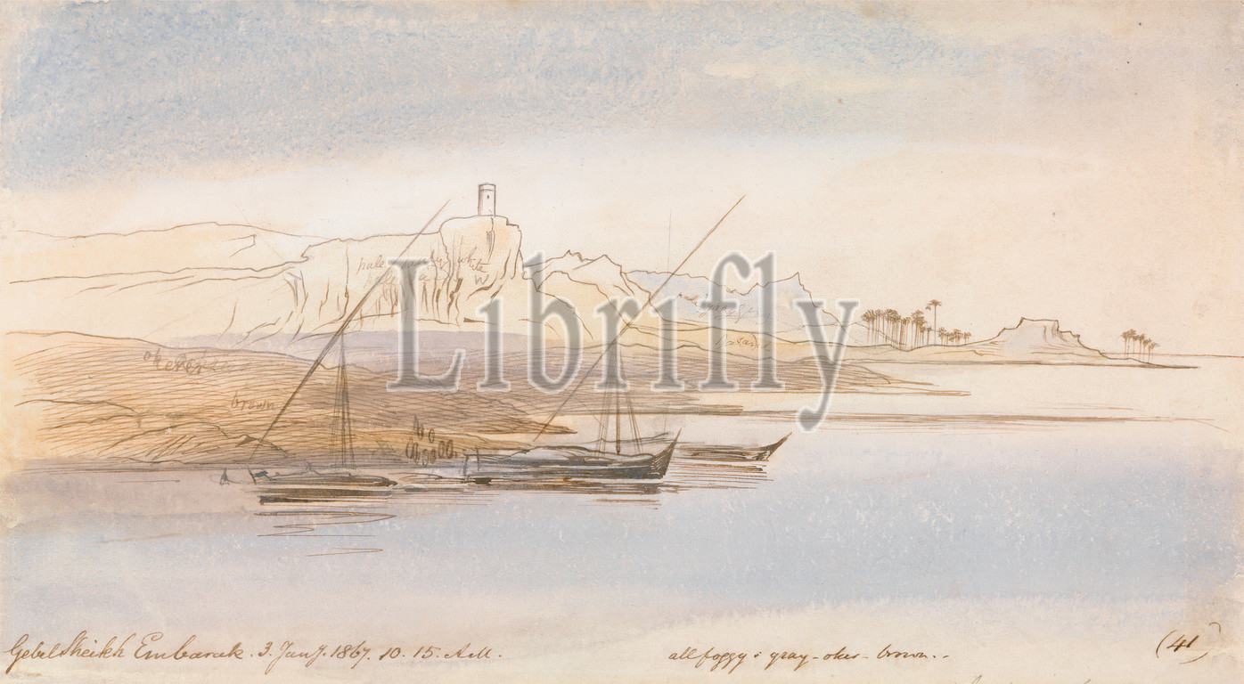 Gebel Sheikh Embarak, Edward Lear, 1812–1888, British, 1867, Watercolor, graphite, pen, brown ink, moderately thick, slightly textured, cream wove paper, Sheet, boats, figures, representations, marine art, palm trees, river, river, riverbank, sky, water, Africa, Egypt, Nile