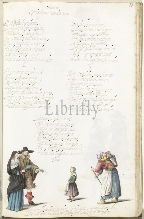 Gentleman, lady standing, poor mother, children, gentleman, lady standing, poor mother, children, next, poem, tune, Lief locksters van die min, drawing, Gesina, written, text, Ovid, draughtsman, Gesina ter Borch, Gesina ter Borch, Zwolle, 1654, 1655, paper, brush, height 313 mm, width 204 mm