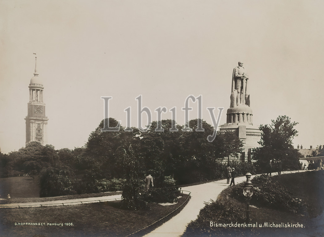 Georg Koppmann, Bismarck Monument, St, Michaelis Church, St, Michaelis Memorial Folder, Staatliche Landesbildstelle Hamburg, Collection, History, Photography, silver gelatin paper, black, white positive process, inscribed, einbelichtet G, KOPPMANN & Co, Hamburg 1906, Bismarck Monument, St, Michael's Church, landscape photography, architectural photography, gardens, parks, monument, statue, church tower, St, Michaelis Memorial Folder, last, ten portfolios, photographs, Hamburg, Georg Koppmann dedicated, home city, folder, published, fire, main church, St, Michaelis, collapsing tower, burnt-out ruins, focus, portfolio, Koppmann supplements, reproductions, historical engravings, pictures, intact building, photographs showing St, Michaelis, Hamburg landmark, career spanning, Koppmann, benefits, experience, event photographer, draw, strengths, extensive archive, city views, Sven Schumacher
