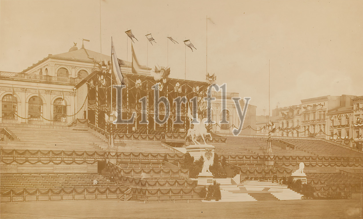 Georg Koppmann, Hamburg, Rathausmarkt, tribune, ceremonial act, reception, 2nd Hamburg Infantry Regiment, June 17, 1871, albumin paper, black, white positive process, dry stamp, Photography, G, Koppmann & Co, Hamburg, inscribed, Gesch von, illegible monogram, reporting photography, historical events, persons, places, historical event, situation, hist, Building, location, street, monument, statue, equestrian statue, sculpture, sculpture, sculpture art, flags, standards, military, wreath, garland, military festivities, Hamburg