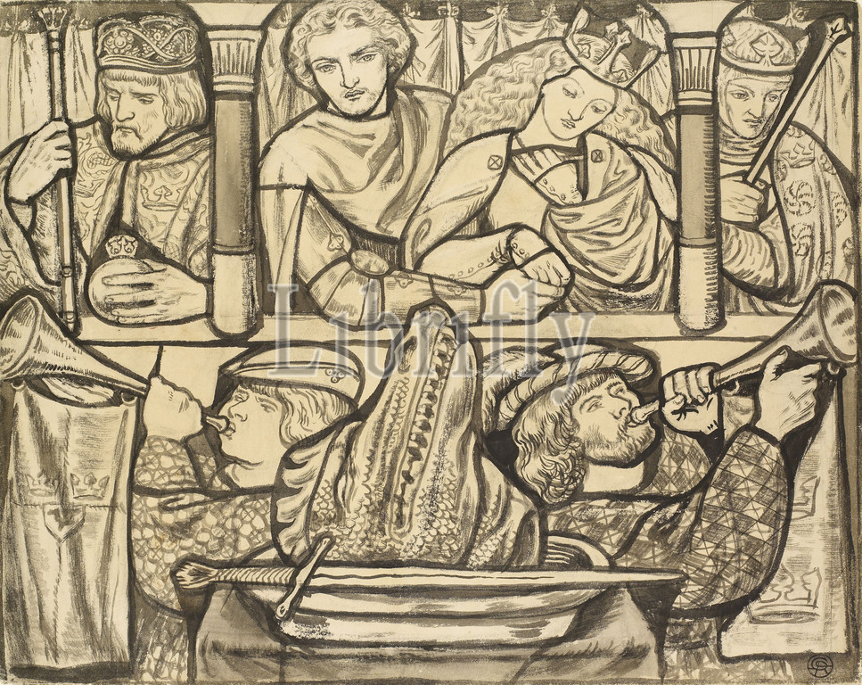 St George and the Dragon, The Wedding of St George, 1861-62 Dante Gabriel Rossetti, Drawing, Ink, Stained Glass, Pre-Raphaelite, Design, Wash drawing, Religion, Saint, Legend