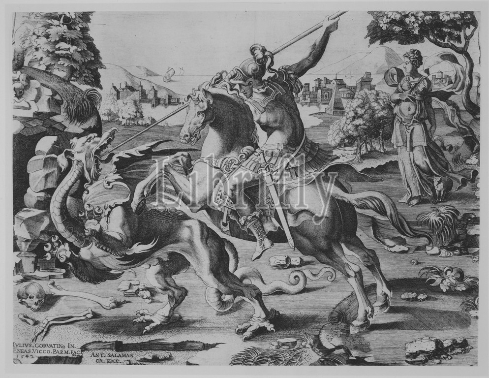 St George Killing, Dragon, 1542, Engraving, sheet, 10 1/16 x 13 9/16, 25.6 34.4 cm, Prints, Engraved by Enea Vico, Italian, Parma, 1523–1567, Ferrara, After Giulio Clovio, Brizane, 1498–1578, Rome