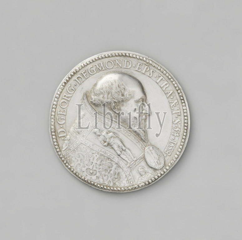 George van Egmond, sixtieth bishop, Utrecht, black-and-white Medal, Front, man's bust, right, bareheaded, dressed, canopy, decorations, compartments, edge, standing John, Baptist, holding, lamb, arms, agrafe, figuring Christ, Description within, pearl rim, Reverse, two hands, clouds scatter coins, landscape, trees, church, left, ruins, Circular inside pearl rim, Signed, compartment, Steven Cornelisz, van Herwijck, mentioned, object, Antwerp, 1558, black-and-white, metal, engraving