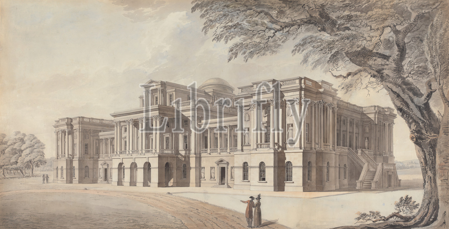 Georgian Mansion, front, side elevations, eighteenth century, Previously Thomas Sandby RA, 1721–1798, British, ca, 1790, Watercolor, pen, black ink, medium, moderately textured, white laid paper, Sheet, architectural subject, architecture, columns, architectural elements, Corinthian order, dome, front elevations, Georgian, landscape, mansion, path, people, pilasters, side elevations, trees