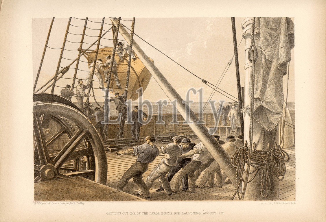 Getting out, large buoys, launching, August 2nd, Float, Great Eastern Sailboat, August 22, 1865, lay, transatlantic cable, Signed, E. Walker lith., drawing, R. Dudley, Day &, Son, Limited, Lith, Fig. 20, according, p. 78, Dudley, Robert, ill., Walker, E., lith., Day & Co, 1866, William Howard Russell, Robert Dudley, atlantic telegraph, Dedicated, special permission, Royal Highness Albert Edward Prince, Wales, London, Day, son Limited, 1866