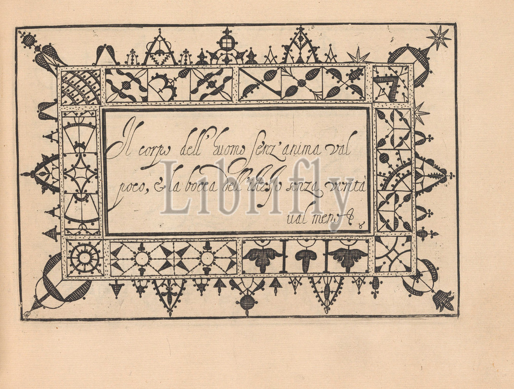 Ghirlanda: Di sei vaghi fiori scielti da piu famosi Giardini d'Italia, page 16 (recto), October 1, 1604, Etching and drawing, Overall: 5 7/8 x 7 7/8 in. (15 x 20 cm), Designed by Pietro Paulo Tozzi, published by Libraria del Giesu, Padua. Calligraphy by Antonello Bertozzi and Sebastian Zanella, scribes of Padua. Design is composed of a central rectangle upon which calligraphic text is printed in black