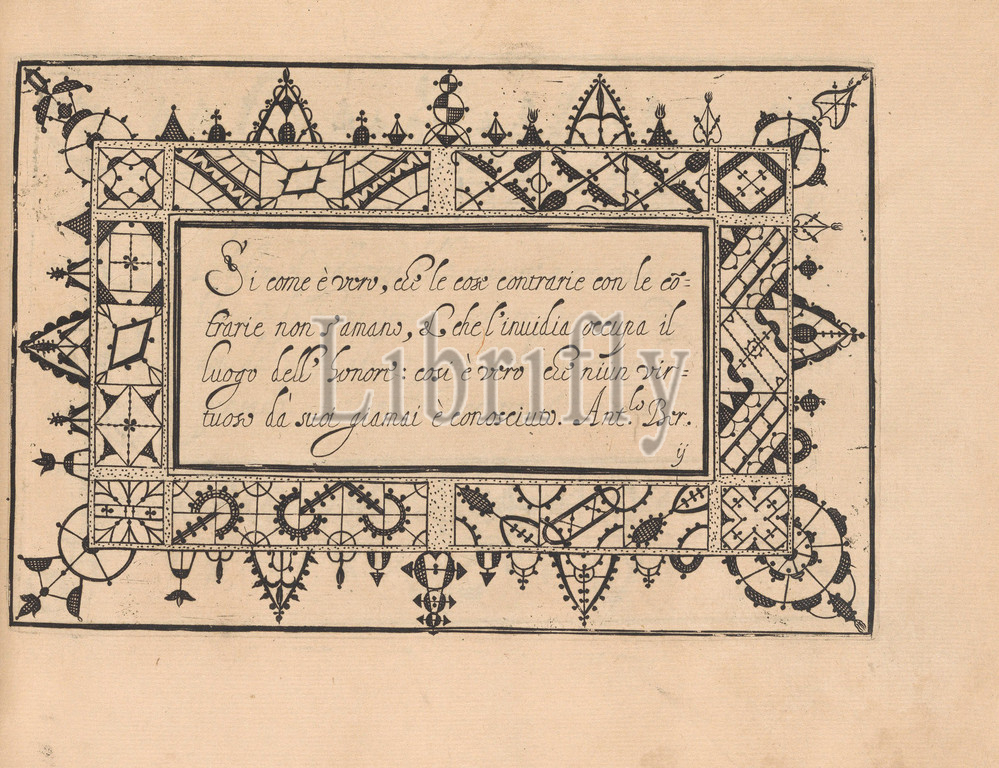 Ghirlanda: Di sei vaghi fiori scielti da piu famosi Giardini d'Italia, page 19 (recto), October 1, 1604, Etching and drawing, Overall: 5 7/8 x 7 7/8 in. (15 x 20 cm), Designed by Pietro Paulo Tozzi, published by Libraria del Giesu, Padua. Calligraphy by Antonello Bertozzi and Sebastian Zanella, scribes of Padua. Design is composed of a central rectangle upon which calligraphic text is printed in black