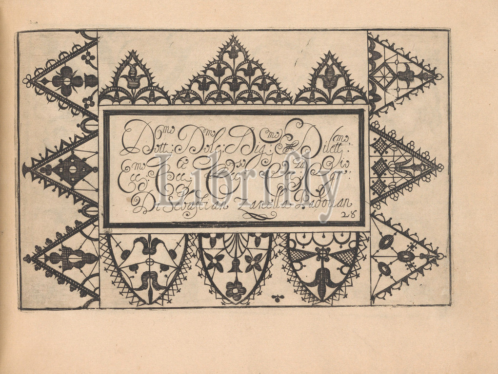 Ghirlanda: Di sei vaghi fiori scielti da piu famosi Giardini d'Italia, page 36 (recto), October 1, 1604, Etching and drawing, Overall: 5 7/8 x 7 7/8 in. (15 x 20 cm), Designed by Pietro Paulo Tozzi, published by Libraria del Giesu, Padua. Calligraphy by Antonello Bertozzi and Sebastian Zanella, scribes of Padua. Design is composed of a central rectangle upon which calligraphic text is printed in black