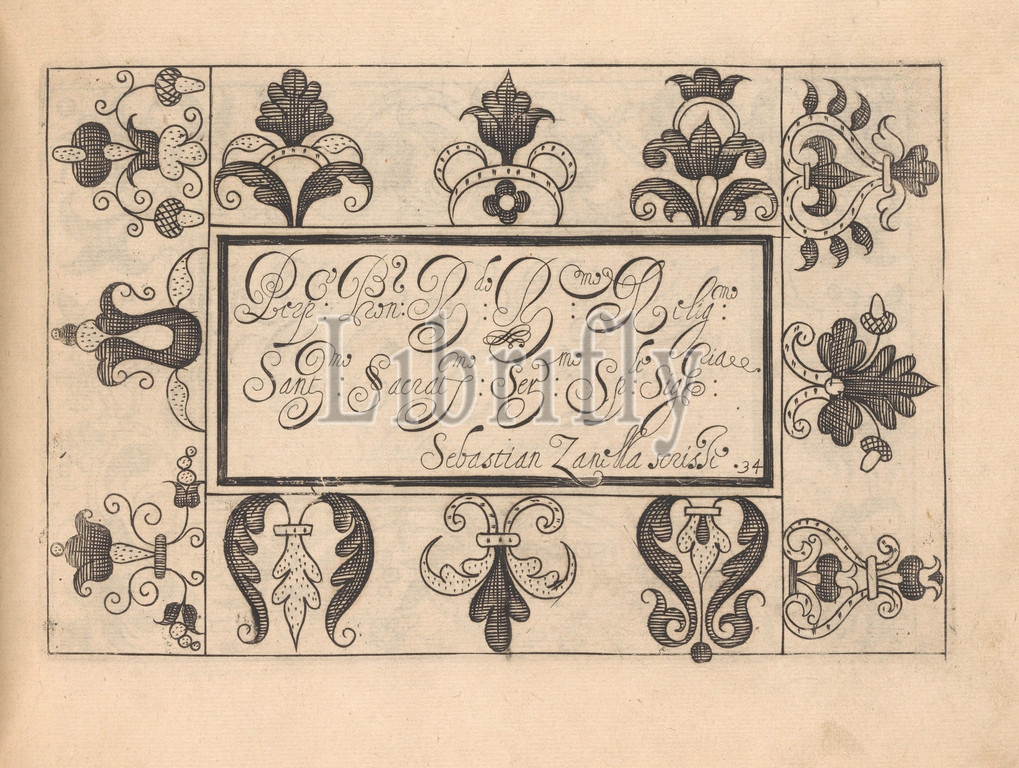 Ghirlanda: Di sei vaghi fiori scielti da piu famosi Giardini d'Italia, page 42 (recto), October 1, 1604, Etching and drawing, Overall: 5 7/8 x 7 7/8 in. (15 x 20 cm), Designed by Pietro Paulo Tozzi, published by Libraria del Giesu, Padua. Calligraphy by Antonello Bertozzi and Sebastian Zanella, scribes of Padua. Design is composed of a central rectangle upon which calligraphic text is printed in black