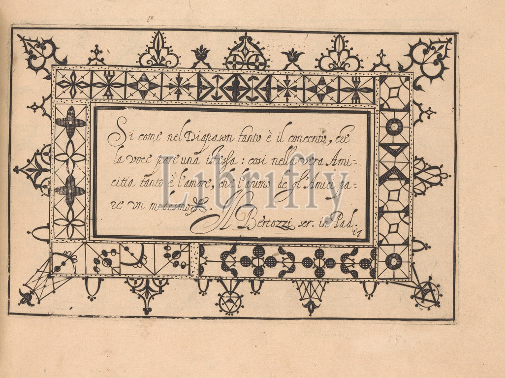 Ghirlanda: Di sei vaghi fiori scielti da piu famosi Giardini d'Italia, page 25 (recto), October 1, 1604, Etching and drawing, Overall: 5 7/8 x 7 7/8 in. (15 x 20 cm), Designed by Pietro Paulo Tozzi, published by Libraria del Giesu, Padua. Calligraphy by Antonello Bertozzi and Sebastian Zanella, scribes of Padua. Design is composed of a central rectangle upon which calligraphic text is printed in black