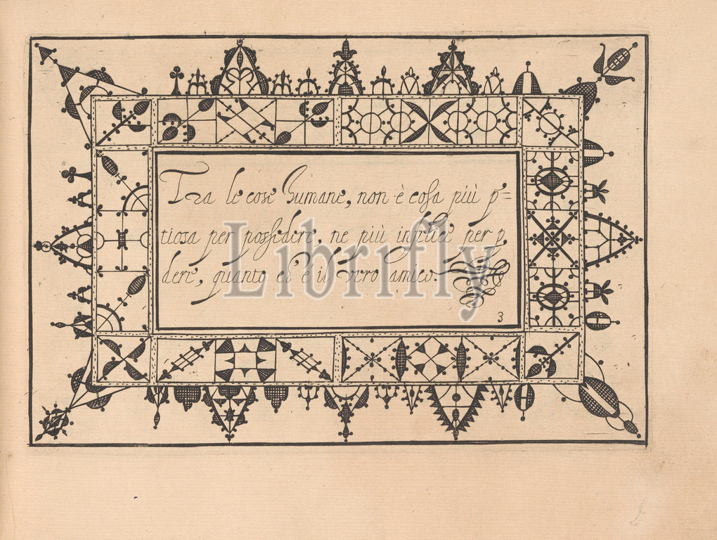 Ghirlanda: Di sei vaghi fiori scielti da piu famosi Giardini d'Italia, page 11 (recto), October 1, 1604, Etching and drawing, Overall: 5 7/8 x 7 7/8 in. (15 x 20 cm), Designed by Pietro Paulo Tozzi, published by Libraria del Giesu, Padua. Calligraphy by Antonello Bertozzi and Sebastian Zanella, scribes of Padua. Design is composed of a central rectangle upon which calligraphic text is printed in black