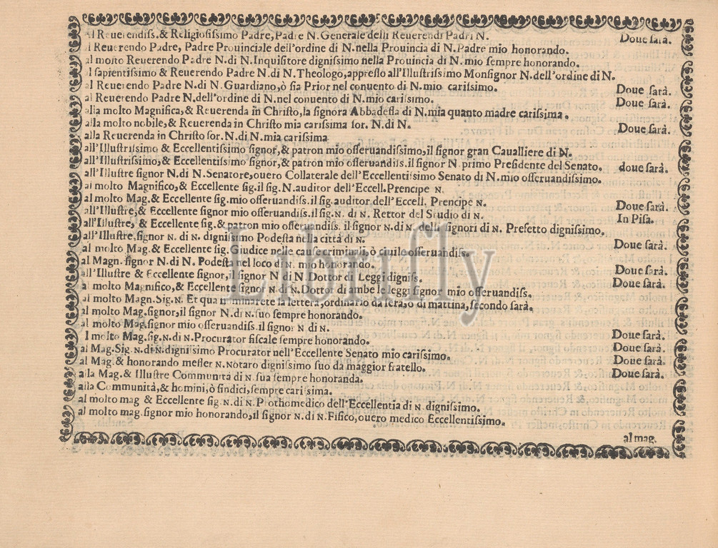 Ghirlanda: Di sei vaghi fiori scielti da piu famosi Giardini d'Italia, page 5 (verso), October 1, 1604, Etching and drawing, Overall: 5 7/8 x 7 7/8 in. (15 x 20 cm), Designed by Pietro Paulo Tozzi, published by Libraria del Giesu, Padua. Calligraphy by Antonello Bertozzi and Sebastian Zanella, scribes of Padua. Third page (of five) of different inscriptions for people of various titles