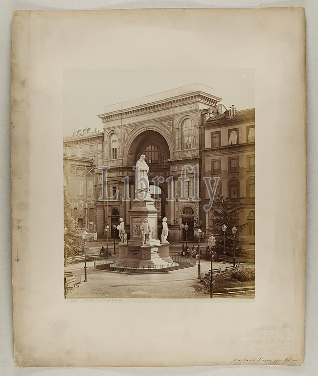 Giorgio Sommer, Milan, Leonardo da Vinci, albumin paper, black, white positive process, sheet size, inscribed, recto and, exposed, Leonardo da Vinci, well, handwritten, cardboard, Milan entrance, gallery, handwritten numbered, on, cardboard, GIORGIO SOMMER, Largo Vittoria, NAPOstamp, on, back, cardboard, inventory, travel photography, monument, statue, public building, department store